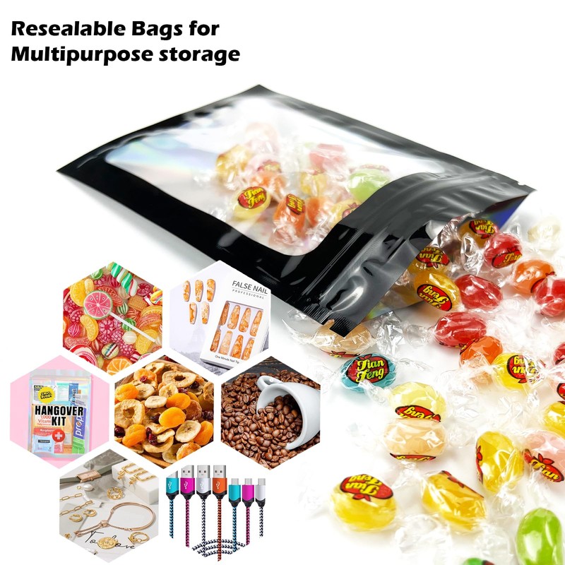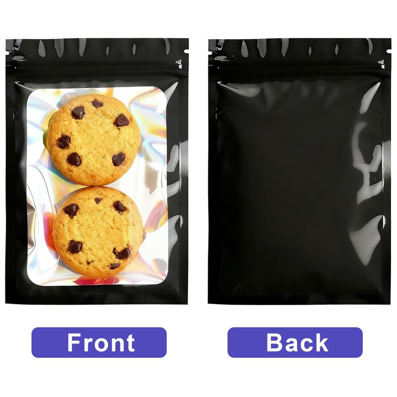 300 Pcs Holographic Mylar Bags Bulk, Smell Proof Resealable Bags with Clear Window, Foil Pouch for Small Business and Food Storage (Black, 4.7"x7.9")