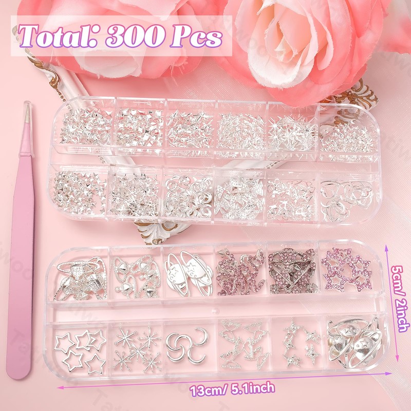 - Silver Nail Charms: This set contains 300 pieces silver nail gems and charms, you can mix and match other Y2K nail charms to create your unique and personalized nail art design