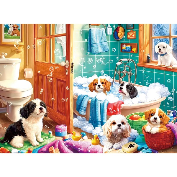 - Playful Bubble Party: Features adorable puppies splashing in the bathtub, creating a joyful and heartwarming bathroom scene.