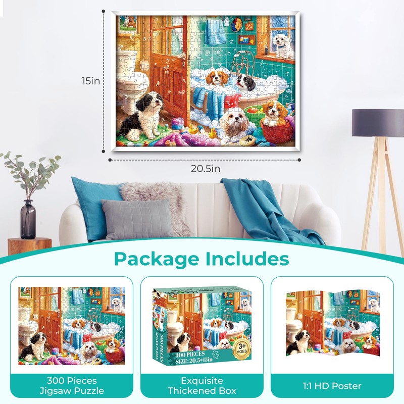 300 Pieces Puzzles for Adults,Bath Puppy Puzzle for Adults,Large Puzzle Piece for Seniors,Cute Dogs Themed Jigsaw Puzzles for Kids Ages 8-10,Puzzles for Family Game Nights, 20.5 x 15 in