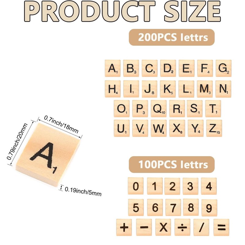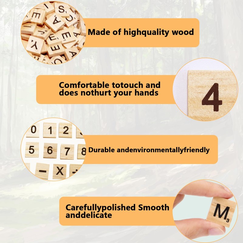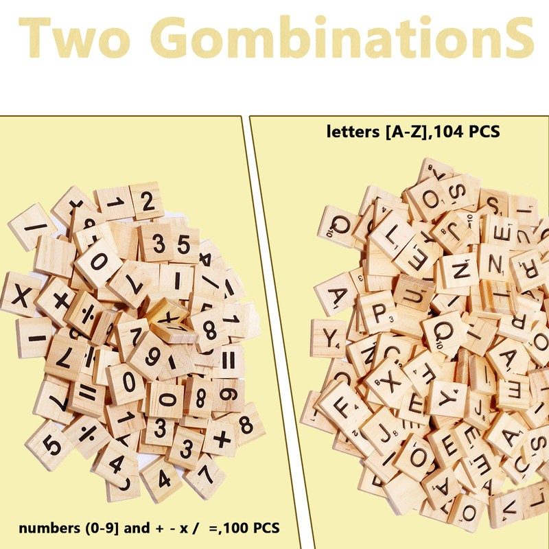 - Multiple combinations: our set consists of 200 wooden letters, 100 pieces numbers and corresponding combinations and is included, contains 26 letters of the alphabet (A-Z), numbers (0-9) and symbols (+, -, ×, ÷,=), perfect for playing letter tile games and mathematically inspired teaching more practical.