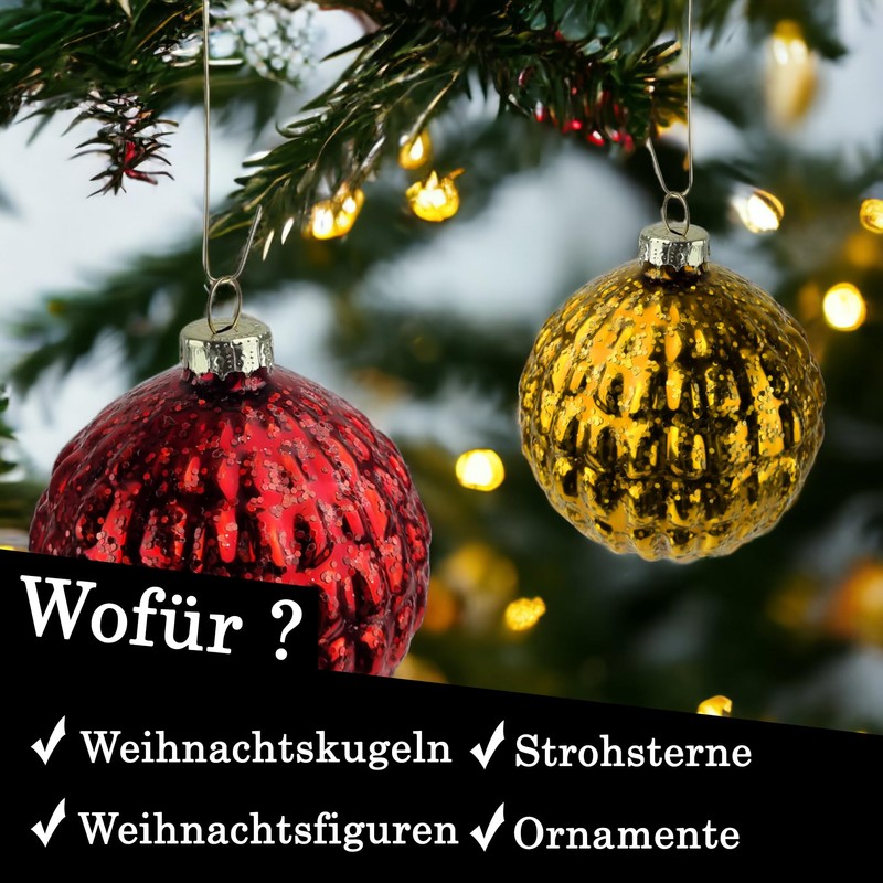 Our hangers allow effortless attachment of Christmas baubles, tree decorations and straw decorations. Enjoy a stress-free decoration of your Christmas tree! Our convenient hooks make effortless positioning and hanging of Christmas ornaments, Christmas baubles, and decorations a breeze. Simplify your Christmas decoration and enjoy uncomplicated holiday fun!