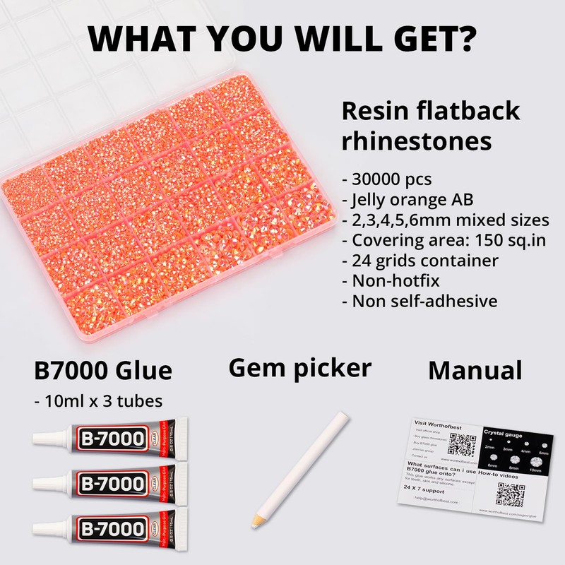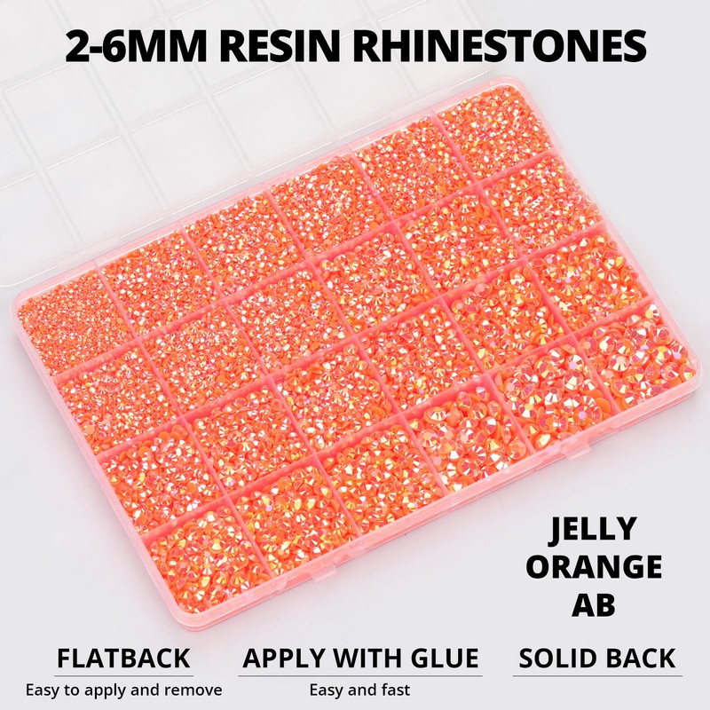 30000Pcs Resin Jelly Rhinestones Set for Crafting Bedazzling, Orange AB Flatback Gems Jewels for Crafts Clothes Shoes Fabric Outfit Nails Makeup, Flat Back Crystal 2-6mm with b 7000 Glue