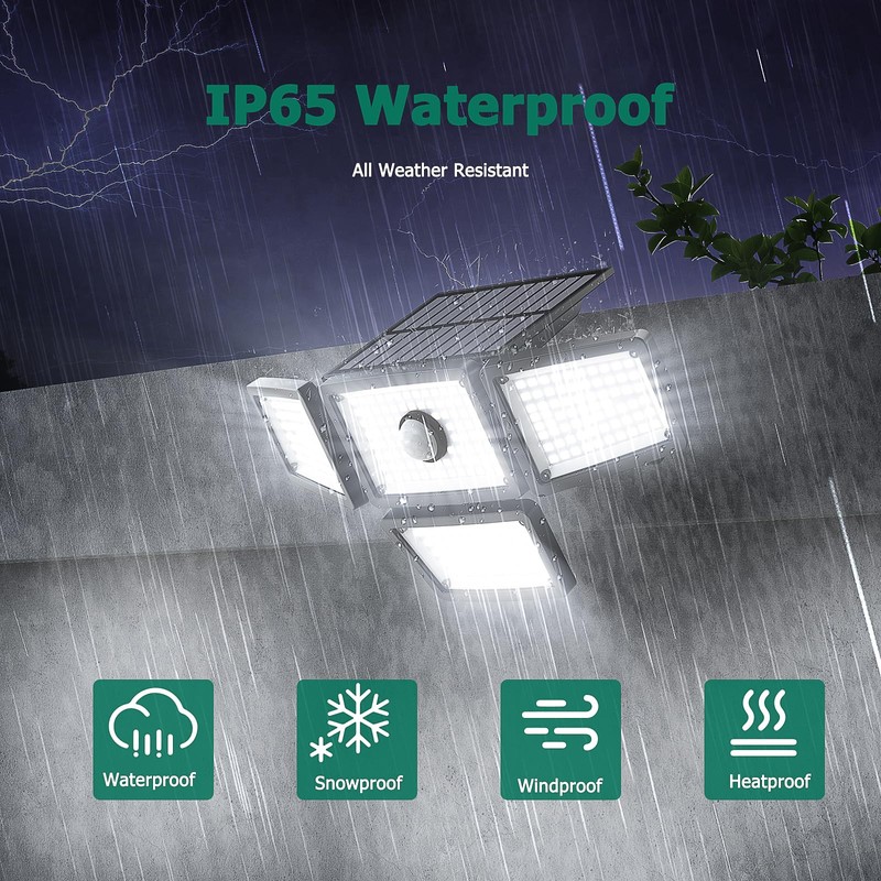 - 【IP65 Weatherproof & Easy Installation】 These solar security lights have IP 65 waterproof rating, which can resist rain, snowstorms and other bad weather conditions. They are designed to withstand outdoor environment and ensure long-lasting performance and durability. Our solar powered outdoor lights are easy to install, and no wires are needed. Just screw the bracket of the solar sensor light into the wall or anywhere get direct sunlight, and then hanging the light.