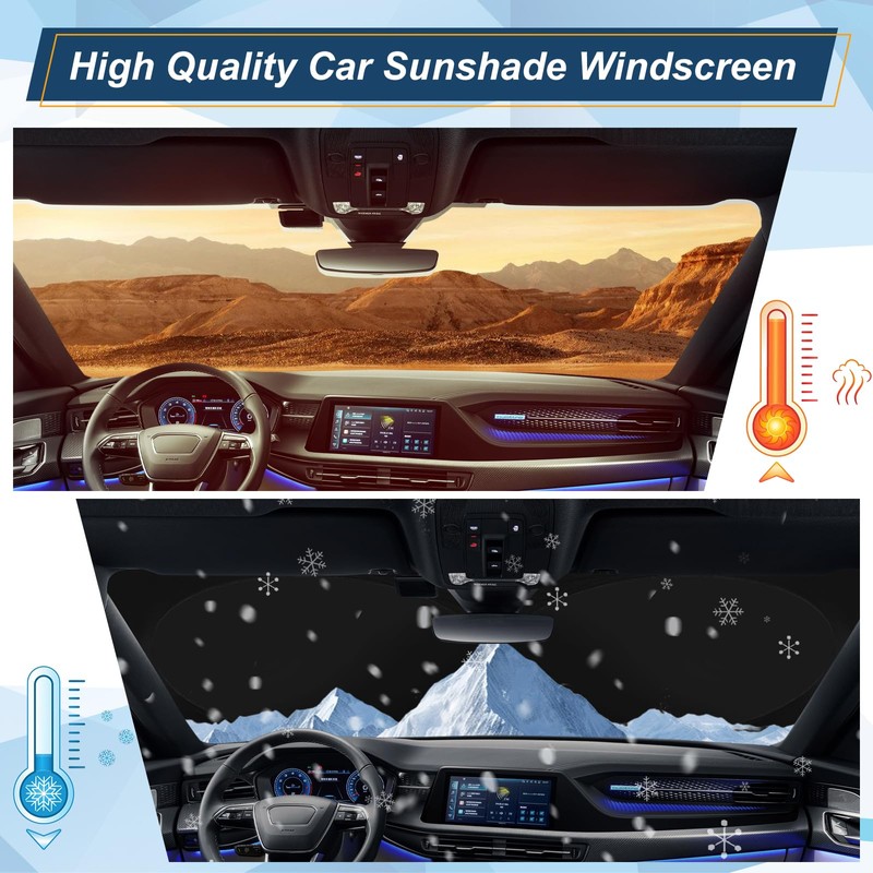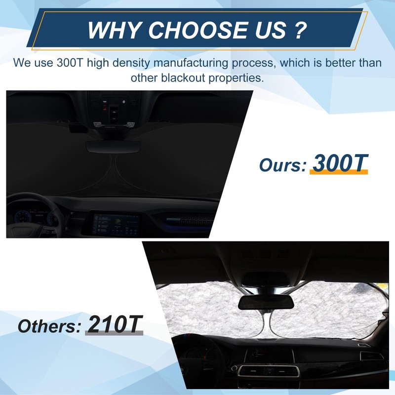 - Thickened Double-Layer Design: This car sunshade windshield features a 300T double-layer thickened design. Compared to the standard 210T density, it demonstrates exceptional performance in blocking sunlight and heat, providing your vehicle with double-layer protection.