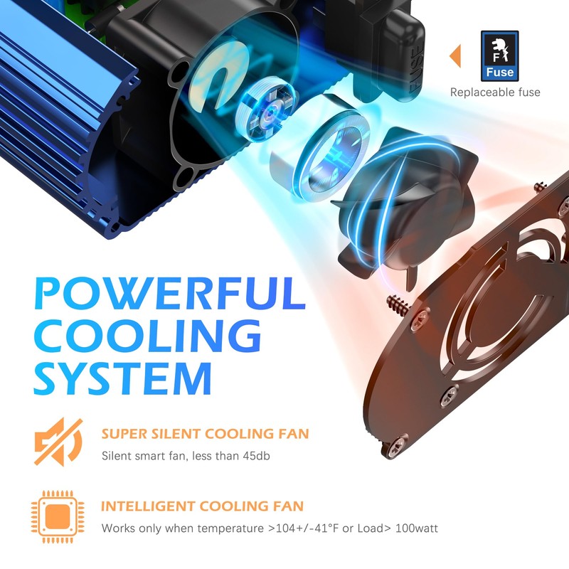 - 【SUPER SILENT AND INTELLIGENT】The smart cooling fan only works when temperature>104+/-41℉ or your loads exceed 100watt. And the sound of cooling fan is lower than 45dB, hardly to hear it