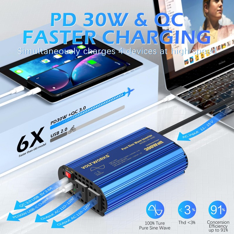 300W Pure Sine Wave Power Inverter for Car Truck RV Adapter DC 12V to AC 110V 120V with USB-C PD30W and QC3.0 USB-A and 2 AC Outlets Compatible with Lithium Battery by VOLTWORKS