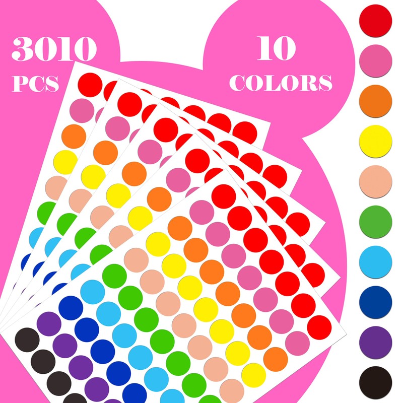 You will receive 43 sheets-3/4 Inch 10 bright colors 70 pieces per sheet,total 3010 pcs round colored dot stickers,Each colorful Coding Labels is 0.75 inches / 1.9 cm,Sheet dimension is Standard Letter Size: 6.8" x8",total 43 sheets,3010 pcs circle labels,Perfect for coding, sealing products and envelopes, Moving Box Marking,the round stickers will give you a positive impact on your life by categorizing your items.