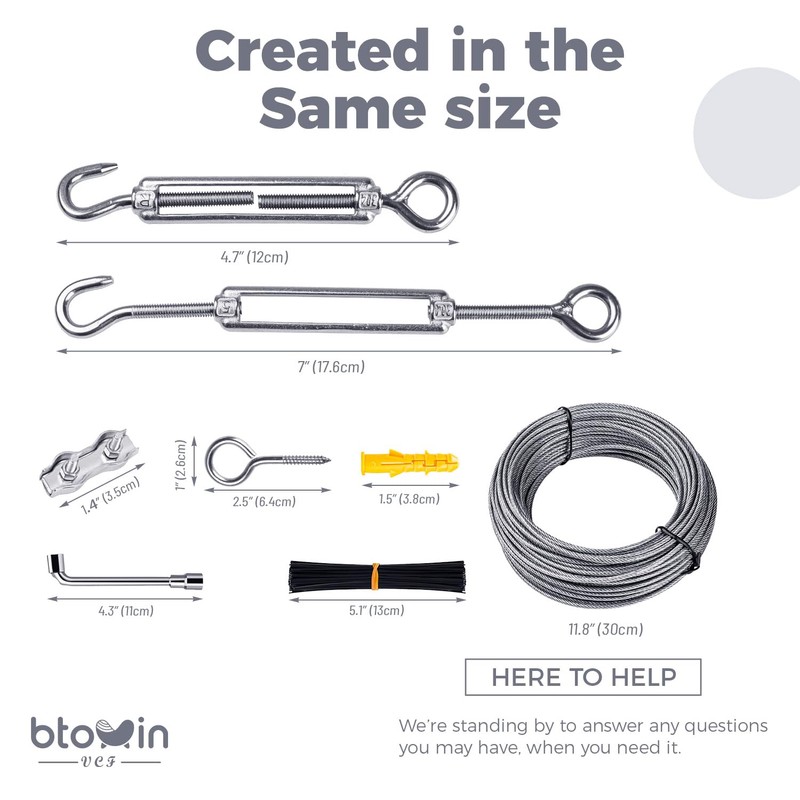 • Multi-purpose DIY wire rope set – this rope tension set is multifunctional and can be used as outdoor tent ropes, washing lines, trellis wire rope, pergola kit, tree climbing rope, room decoration, etc. Enough rope tensioners also allow more flexibility in use: wire trellis kit, sun sail, tree climbing rope, garden wall mounting wire rope. Each accessory has been tested several times before selection so you can be sure of its use.