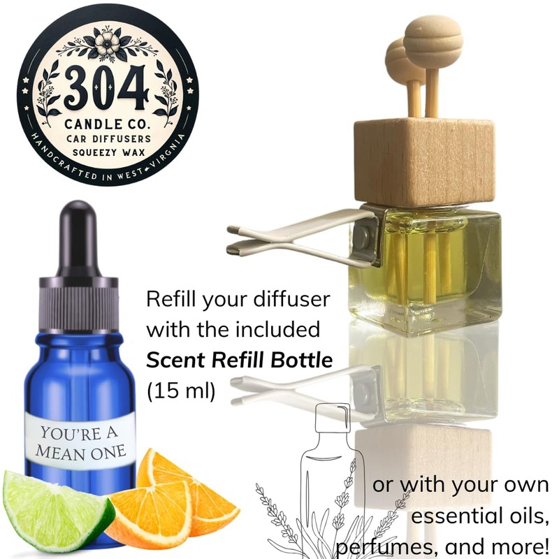 304CandleCo Cute Refillable Car Air Freshener Vent Clip 8mL – You're a Mean One – 15mL Refill Included – Long Lasting Fragrance Oil Diffuser – 100% American Handmade Odor Eliminator