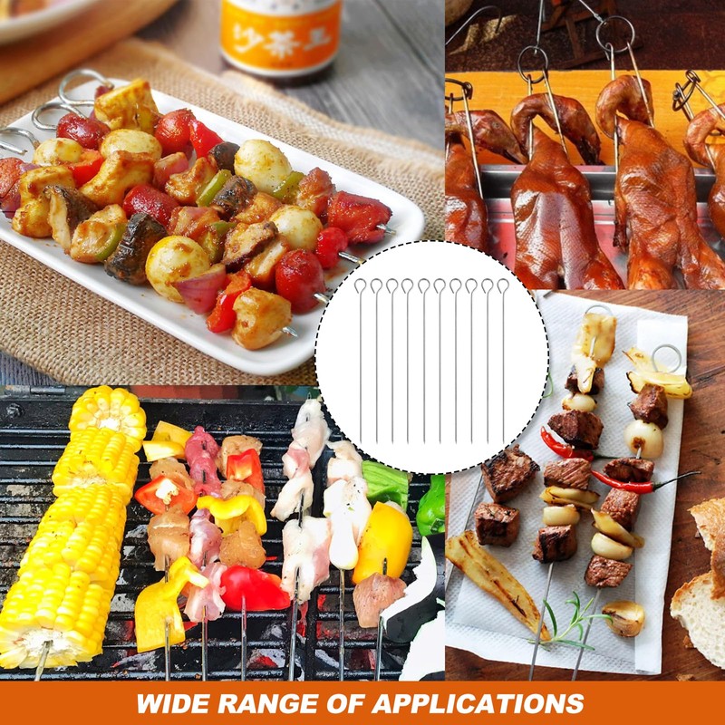 - Perfect Size: Each bbq metal skewers measures 12 inches in length, providing ample space for your favorite food. The ring handle makes it easy to hold and turn the skewers on the grill.
