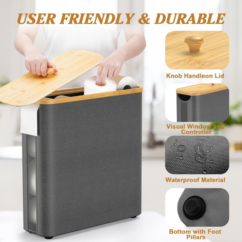 - 【Detail Upgrade】The lid of this toilet paper basket holder adds a wooden handle for easy opening and closing. A clear visual window is added to the side, so you can check the paper towel usage at any time. Ergonomic hollow side handles ensure easy mobility. It has four lifting bases that effectively isolate the wet floor while keeping the toilet paper clean.