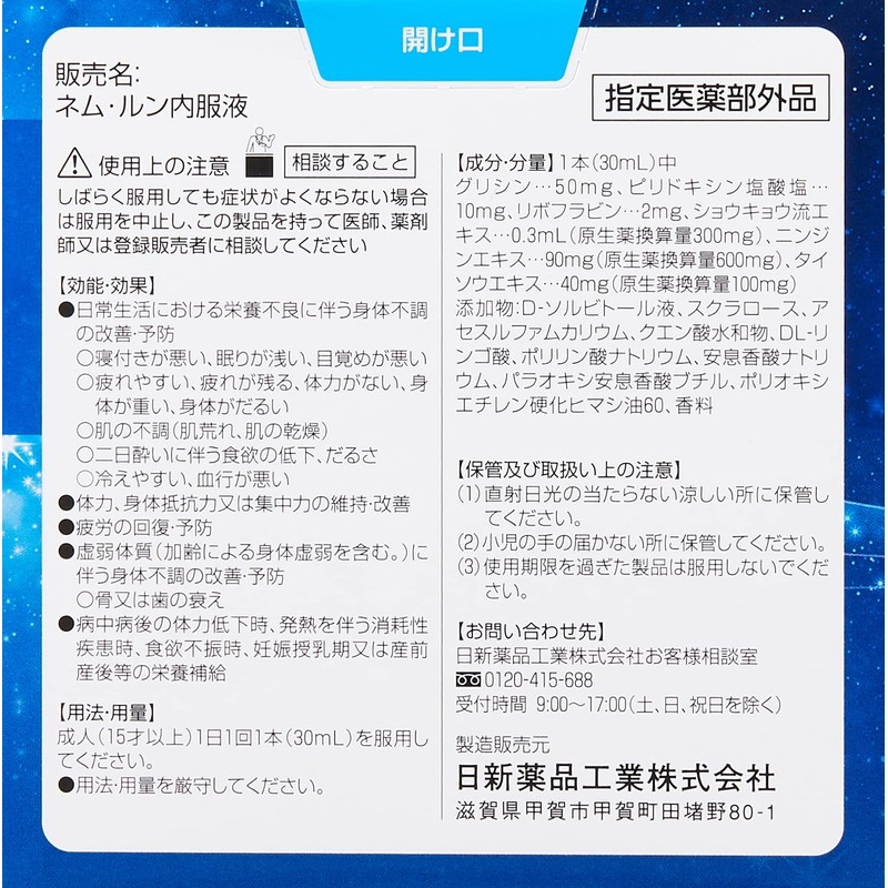 • ✅【 製薬会社が作る安心の 国産 ドリンク 】日新薬品工業は1926年創業。液剤ドリンクの長年の開発実績に基づいた、独自処方の栄養ドリンク「 ネム・ルン内服液」を発売。 ネムルン