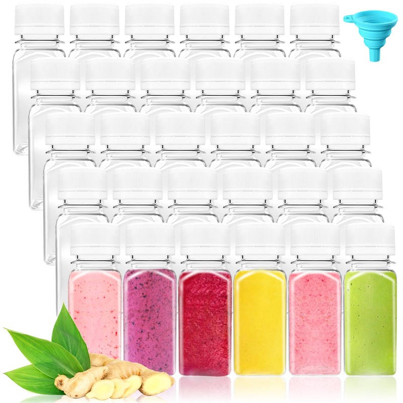 - 【Value Package】This product contains 30pcs 60ml white square bottles,suitable for various storage needs.Perfect for holding liquids,such as juices,drinks,ginger ale,seasonings,cosmetics,medicines or other small items.It also comes with 1 small silicone funnel for easy filling and avoiding liquid spillage.
