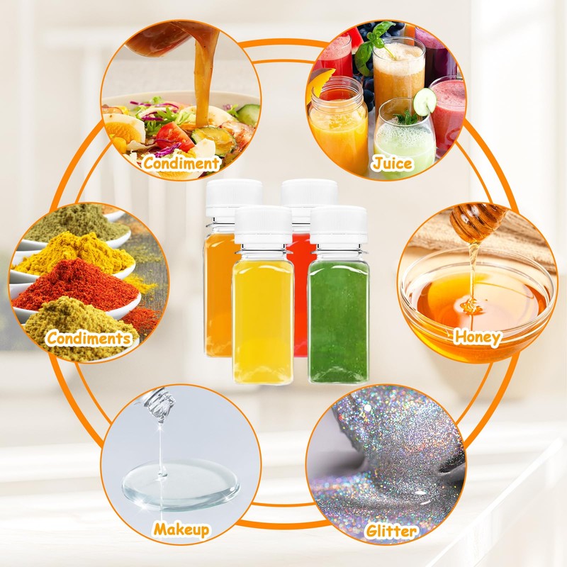Each bottle has a capacity of 2oz/60ml,suitable for storing a variety of juices,liquids,glitter or small granular items,etc.