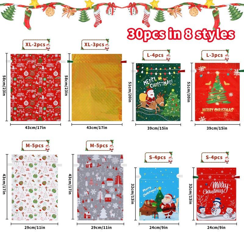 - 【Christmas Gift Bags Assorted Sizes】: You will get 30 xmas gift bags of various sizes. Extra large (58x43 cm, 5 pcs), large (51x39 cm, 7 pcs), medium (43x29 cm, 10 pcs), small (32x24 cm, 8 pcs) and 8 different styles of Christmas pattern designs for packaging Various Christmas gifts.