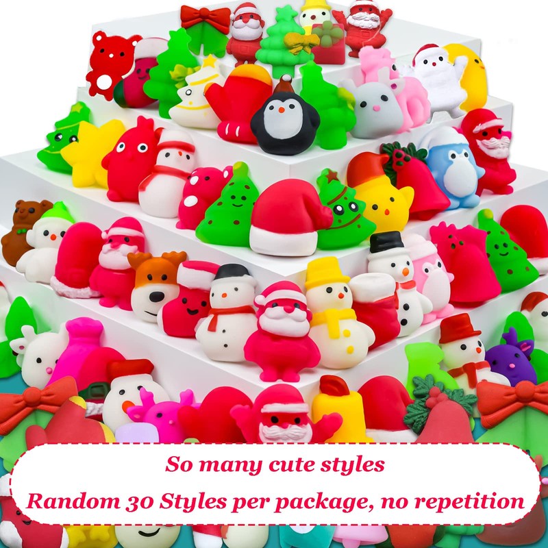 - 🎄「Christmas Goody Gift」30 Pcs Christmas Kawaii Squishies with individually wrapped and different Christmas designs come random.It’s a super value Stress Relief Toys Pack with various different designs about Christmas which includes Santa,Christmas tree,bell,deer,gift,bow,snowman,elf etc.
