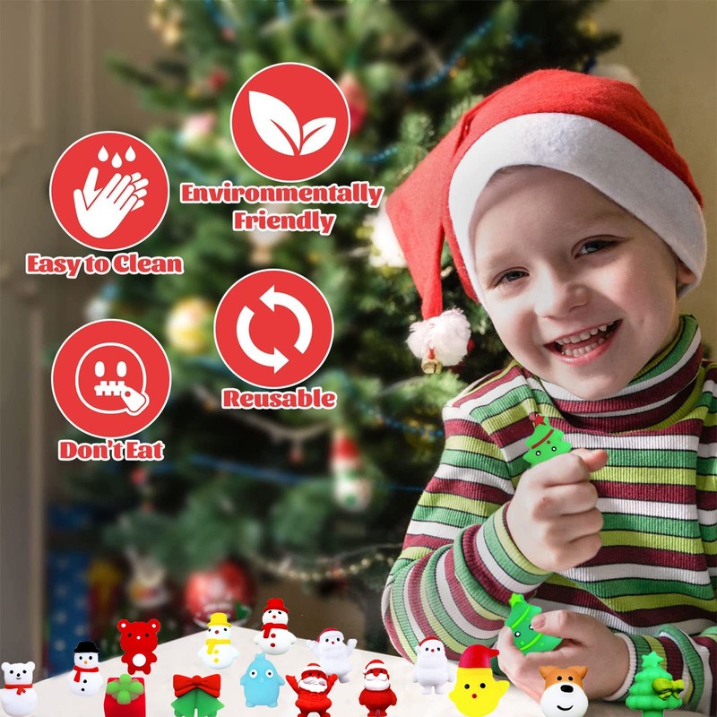 - 🦌「Easy to Clean」 If the christmas mochi squeeze toy toys get dirty after playing, don’t worry about it. They are super easy to clean with warm soap water and use body powder on them, then you'll have whole new mochi squishies, Note: It's not fudge and make sure children won't bite it.