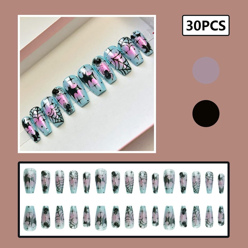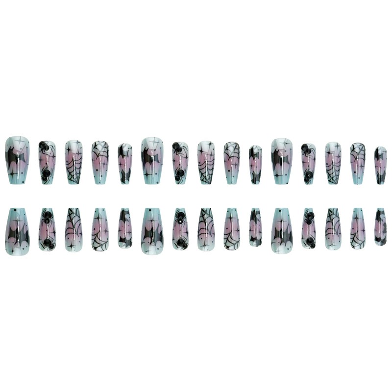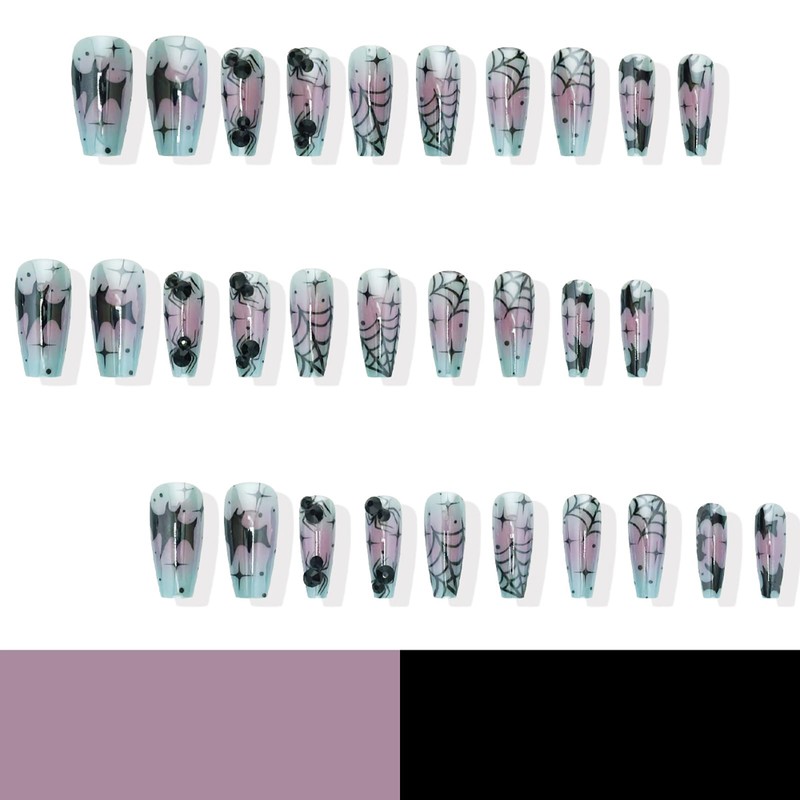- Halloween Design: Cleverly combining pattern elements such as bat and spider webs with classic Halloween colors, coupled with slender coffin shapes, these fake nails emit a charming and bizarre atmosphere
