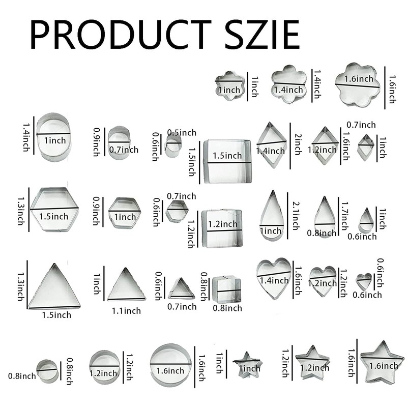 - Mini Cookie Cutter Shapes: 30 mini DIY cookie cut shapes, the cookie cutters set includes 10 shapes, each of 3 sizes - star, flower, hexagon, round, heart, square, triangle, oval, rhombic, raindrop shape.