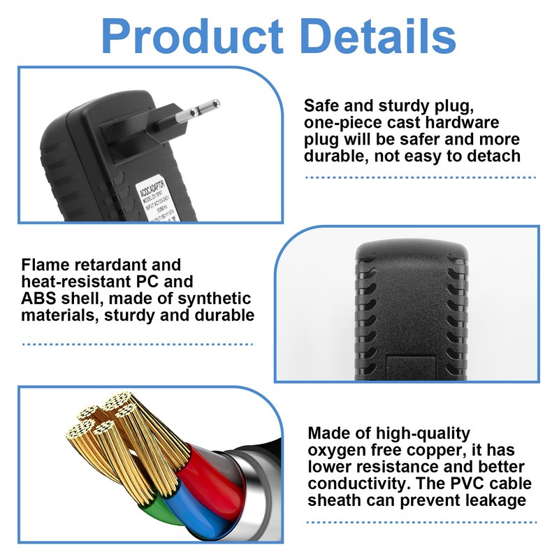 - Lieferumfang & technische Daten: Eingang: 100–240V AC, 50/60Hz. Ausgang: 18V 1.67A, max. 30W. Im Paket enthalten ist 1x weißes Netzteil mit fest integriertem 2m Kabel.