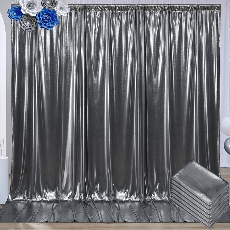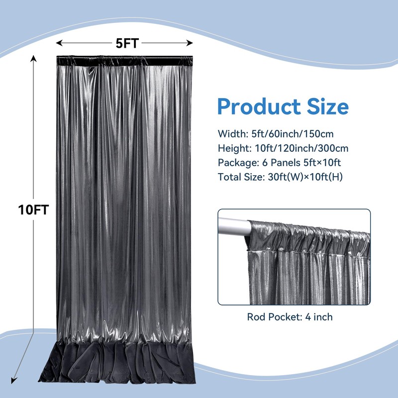 - Versatile Black Silver Shimmer Curtains- The 10ft tall black silver shimmer wall backdrop are perfect for kinds of occassions. such as: wedding,parties,bridal and baby shower,candy buffets,stage backdrop,photo backdrop for photography,birthday theme party backdrop,photobooth,photoshoot,reception background,graduation,ceremony,home decoration and more drapes for backdrops with ballon, flowers, lights, banners decorations.