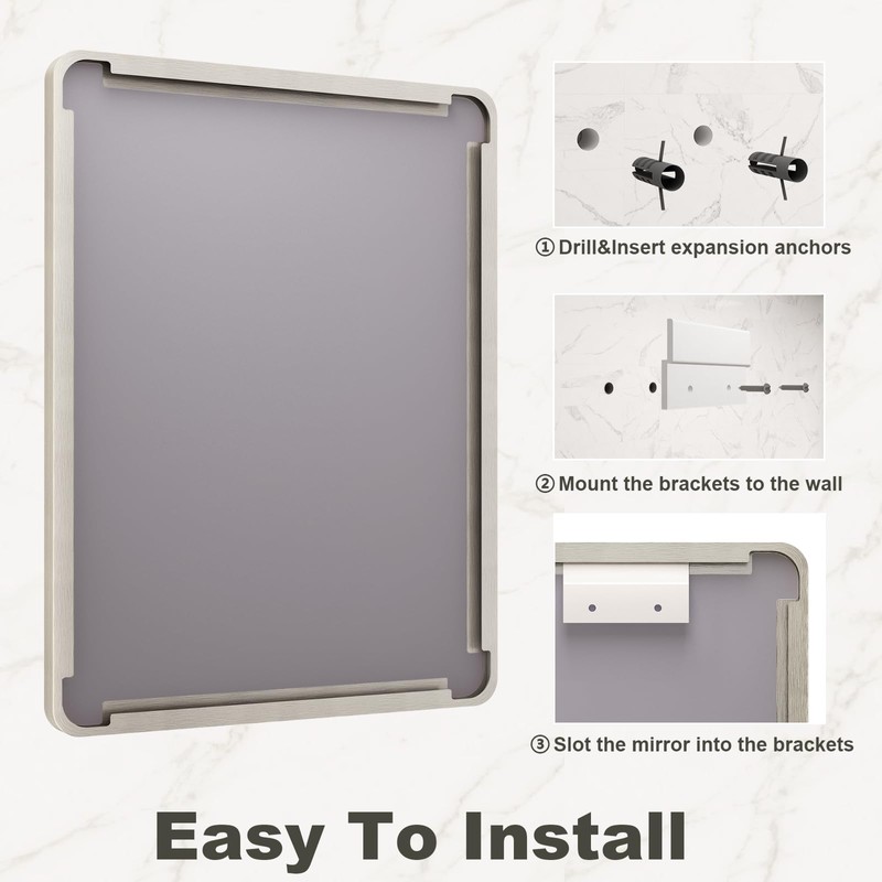 - Durable Silver Brushed Frame: VANLIO brushed nickel bathroom vanity mirror is made of premium brushed aluminum alloy frame, which is rust-proof, corrosion-resistant, and waterproof. More durable and sturdy, and non-deformed. With brushed texture and rounded corners, our Silver framed bathroom mirror looks very elegant and unique with modern and industry style, widely using in bathroom, vanity, farmhouse, bedroom, living room, dining room, entryway, fireplace.