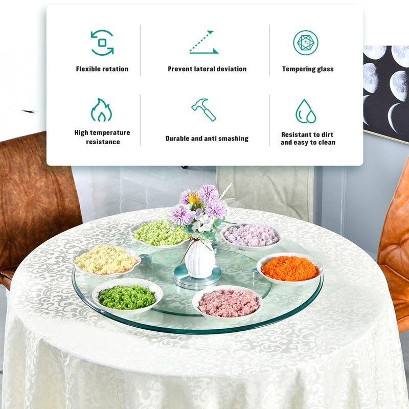 - 【Innovative anti-flip design】Our lazy susan for table top boasts an anti-tip-over design enhanced by innovative auxiliary wheels and a heavy-duty glass centerpiece with 6 rotating silver wheels, ensuring stability and preventing spills. Crafted with an aluminum bearing base, it can effortlessly carry a range of objects from light to heavy.