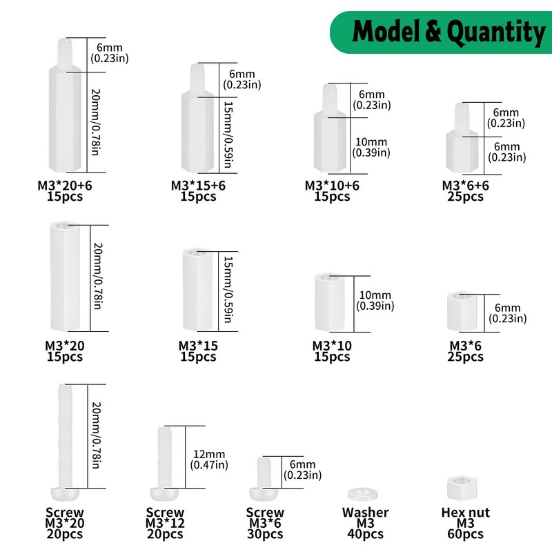 - Package Includes: You will receive a total of 310 pieces of nylon motherboard standoffs and screws, M3 nuts, M3 washers, M3 bolts (3 lengths), M3 hex washers (4 lengths), M3 hex nylon (4 lengths), enough for daily use.