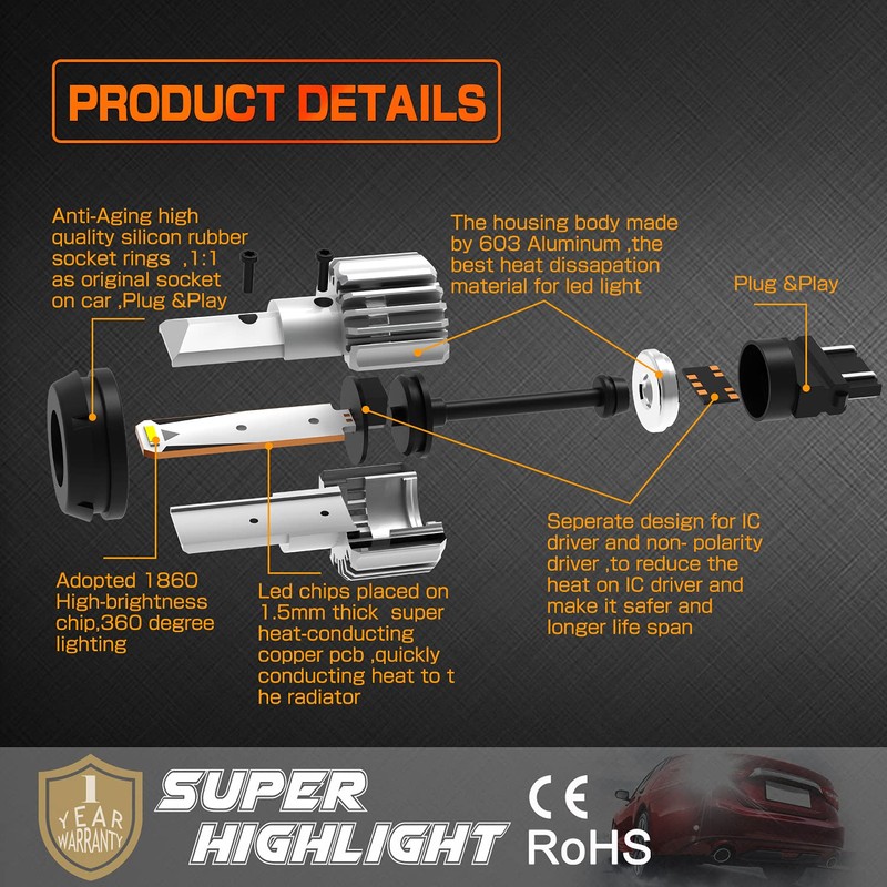 4.3157 3156 LED bulbs with 360-Degree Lighting of View & Longer Lasting: Each 3157 bulbs adopted 1860 high-brightness chip, Non-polarity and 360 degree full angle illumination. Anti-Aging high quality silicon rubber socket rings, 1:1 as original socket on car, plug& play, give your car a refreshed new look and 360 degree lighting ensures optimal visibility. IP65 Grade Waterproof LED bulbs with miniature sealed waterproof OEM Plug.