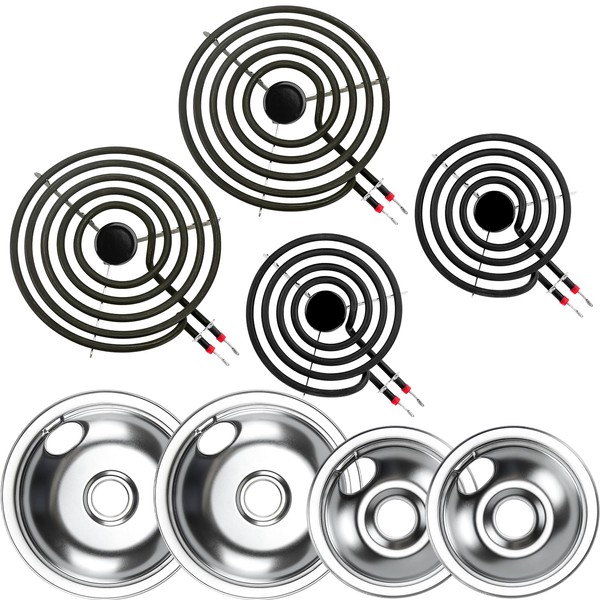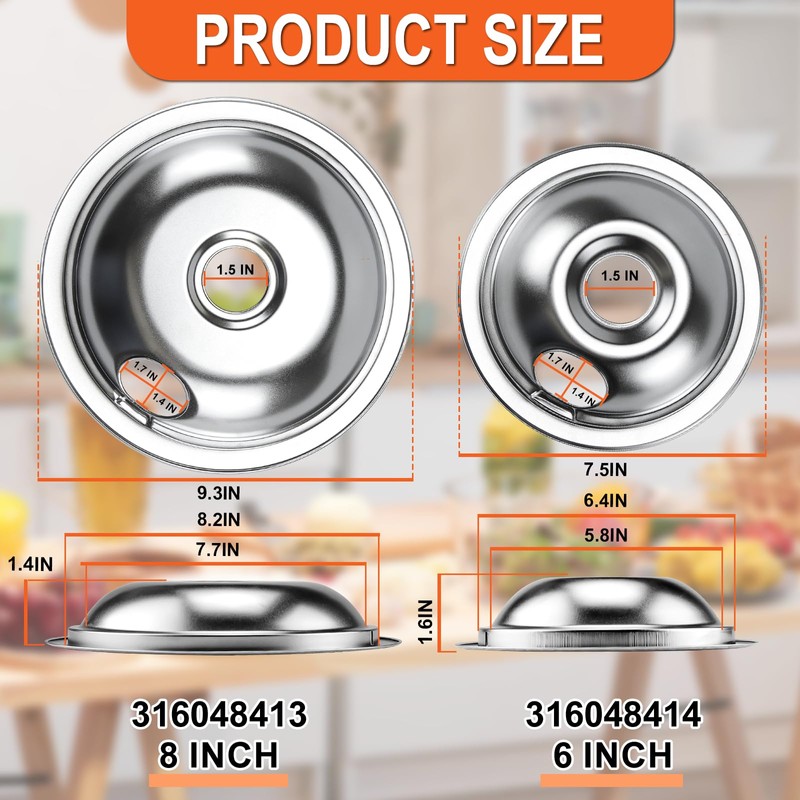 - ➽[IDEAL PACKAGING]:The perfect combination includes: 2 x 316048413 8 inch g-e electric stove drip pans and 2 x 316048414 6 inch chrome burner drip pans, 2 x MP21YA 8 inch Electric Stove Top Burner and 2 x MP15YA 6 inch Burner Surface Element. It can be used in combination to meet your needs and is an essential accessory for the kitchen. INSTALL NOTICE : Prevent burns. Wait until the surface is cool to the touch before installing the drip pans for electric stove