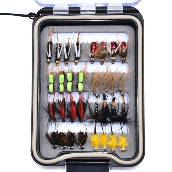 32/40/60/68pcs Fishing Flies Set Dry Wet Flies Nymphs, Streamers, Wooly Buggers, Terrestrials, Insect Lure Set (32pcs Assorted Flies in Fly Box)