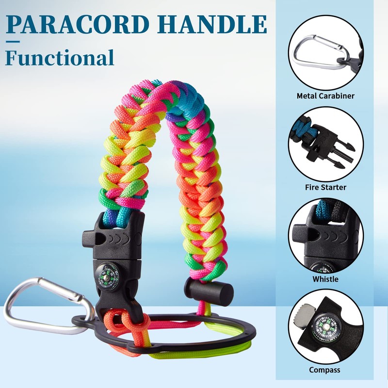 - PERSONALIZATION BOTTLE PARACORD HANDLE - Quarter gallon water bottle with a pretty cool functional paracord handle which does more than meets the eye.?The survival strap cord is made of military-grade nylon and comes with a compass, safety loop, metal carabiner, flint, igniter, and whistle, making it a functional and stylish addition to your thermo water flask, is perfect for outdoor camping, hiking, fitness enthusiasts