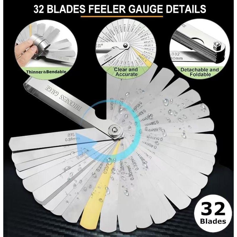 • Measures: Stainless steel tool set,Feeler gauge set measuring from 0.0015 Inch to 0.035 Inch (0.04mm to 0.88 mm);58 pcs Metric & America SAE Type & British Whitworth. Metric is 0.25-6.0mm, Imperial is 4G-62G,US is US: 8, 10, 11, 14, 19, 28