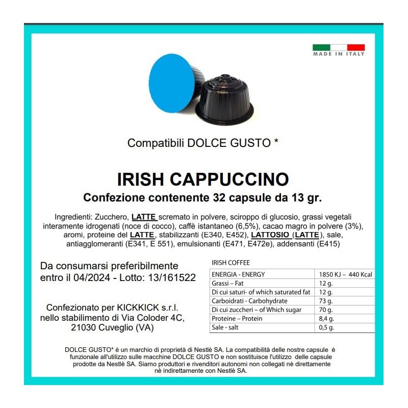 32 Capsules Cappuccino Nescafé Sweet Taste Compatible - Capuchin with Irish Coffe Flavour - Made in Italy - Kickick Caffè