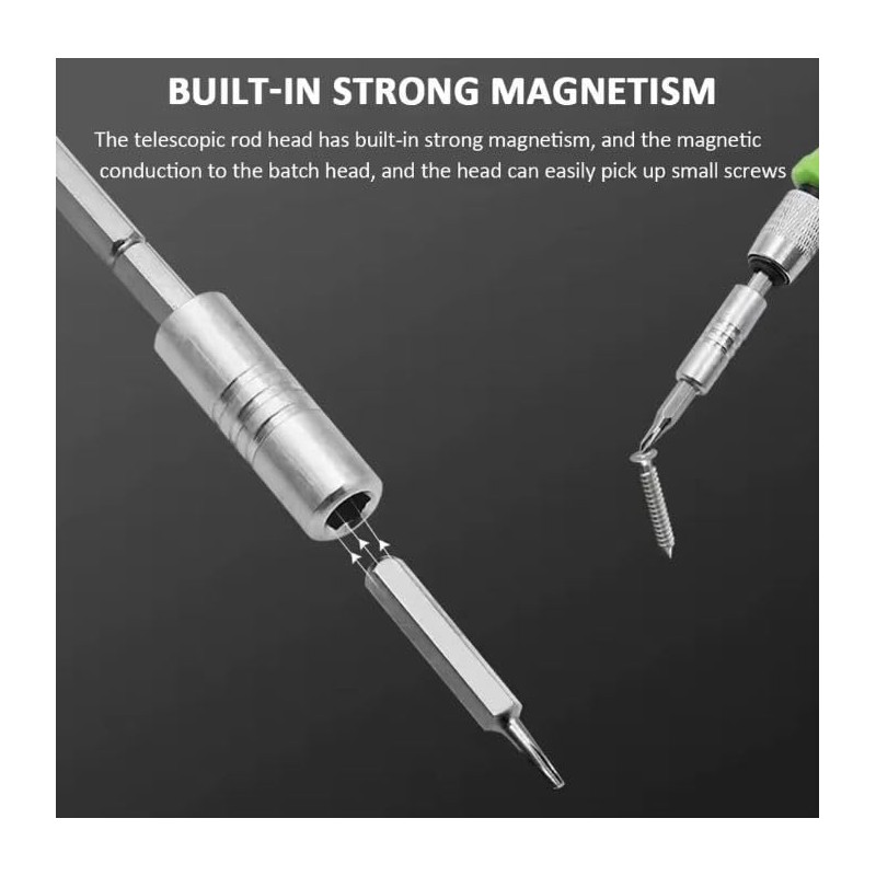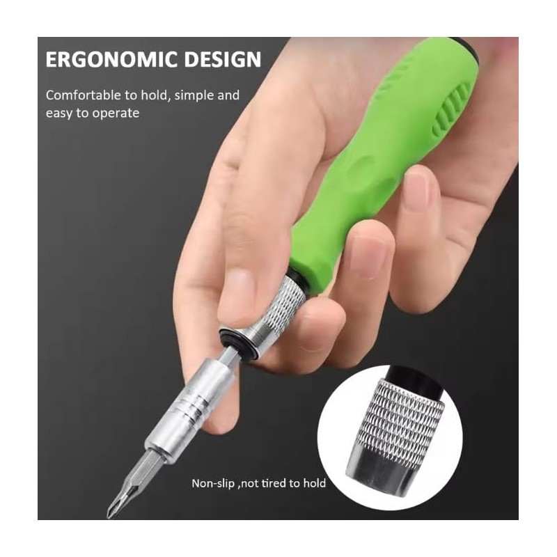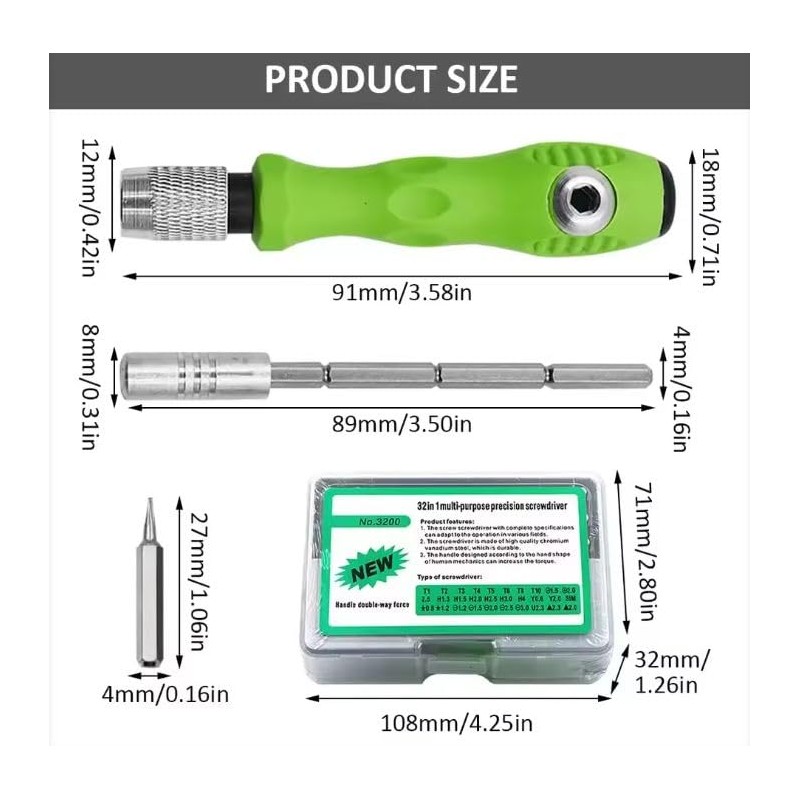- Specification: Material: CRV steel Feature: two batch head Color: green + silver Size(approx.): handle: (L x W x interface diameter)91 x 18 x 12mm/3.58 x 0.71 x 0.42inch extension rod:(L x interface diameter x top diameter)89 x 8 x 4mm/3.50 x 0.31 x 0.16inch drill bit (L x W) 27 x 4mm/1.06 x 0.16inch box: (L x W xH)108 x 71 x 32mm/4.25 x 2.80 x 1.26inch Package Included: 1 PC x Screwdriver Handle 1 PC x Extension Rod 30 Pcs x Drill Bits