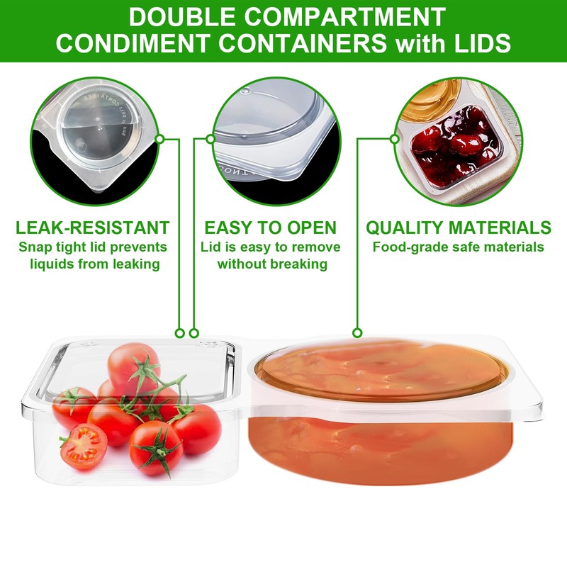 32 Pack Double Compartment Condiment Container -5.5x3.3 inches Plastic Snack Containers with Lids for Sauces, and Salad Dressings | Portable Snackle Box, Portion Control & Food Storage Solution