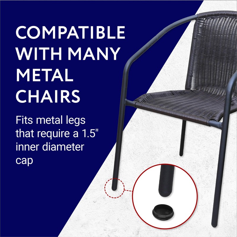 - Ideal Fit - Our 1.5-inch diameter patio furniture leg caps are designed for regular patio chairs. Not adjustable or universally compatible. Equipped with weep holes to snugly fit most standard-sized patio chairs and stools requiring a 1.5-inch diameter cap. For accurate installation, measure your wrought iron cup area's diameter (refer to infographic in images)