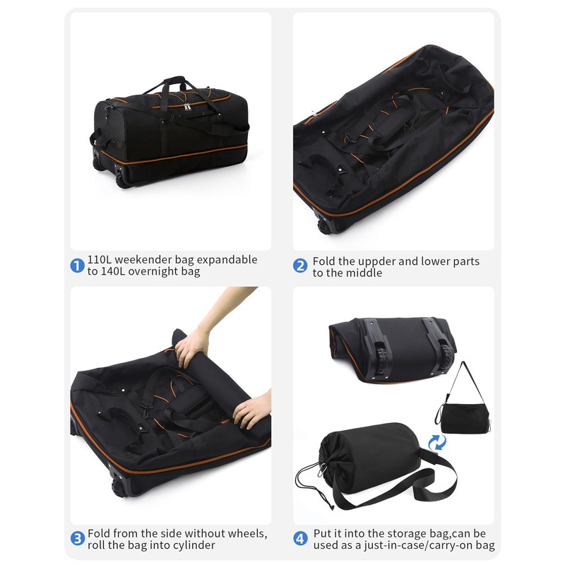 32" Soft-Sided Foldable Wheeled Travel Duffel Bag,Expandable 110L to 140L Rolling Cargo Bag with 2 Wheels and Multiple Pockets (001-Black Orange)