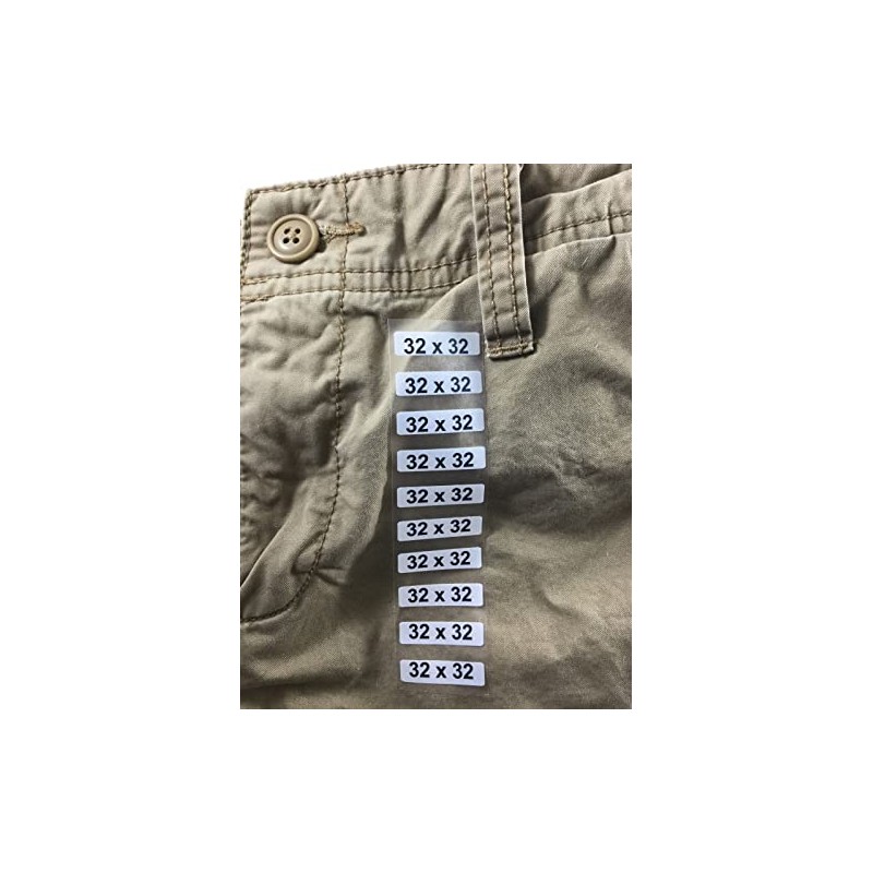 These pant size labels show the size ten times down the clear label. This label takes the guesswork out when the customer is searching for a specific size. These labels measure 1.25 x 5 inches with a white box printed beneath the black text. With this design, no matter what color clothing these labels are on, the customer can see the size easily. The material of the labels is clear plastic, or transparent polypropylene, with an apparel-safe adhesive backing. The adhesive is strong enough for most clothing materials and can be removed and re-adjusted. These size labels stick very well to most materials. These are perfect for folded clothing in any retail store.