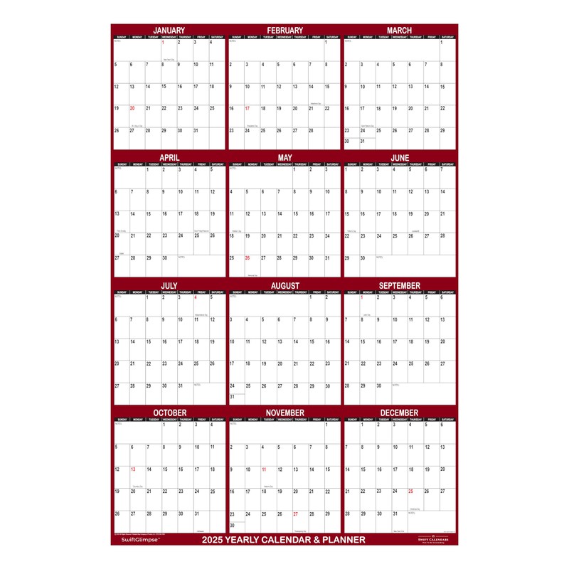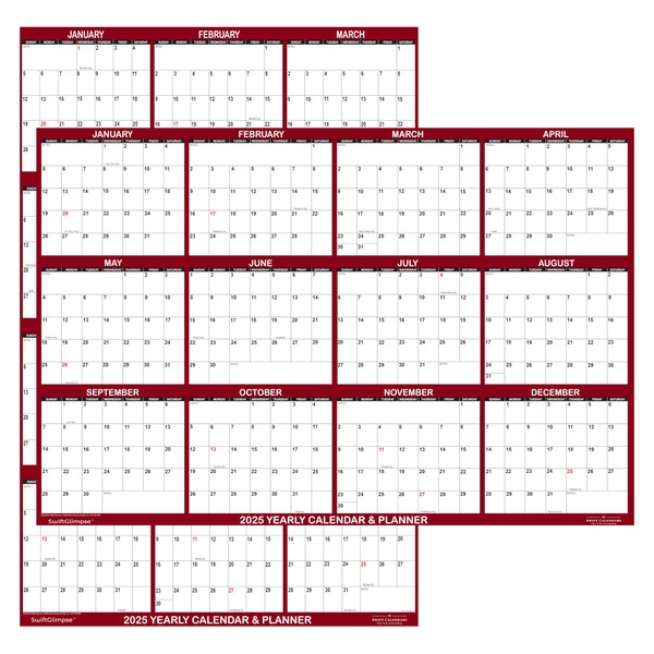 SwiftGlimpse 2025 Erasable Wall Calendar: Our yearly wall calendars give you a "glimpse" and huge poster display of all 12 months, January to December - in one X Large view to keep you organized all year long. Track projects, create schedules, make daily notes, schedule vacations or simply just glimpse ahead at future months. Federal holidays are highlighted in red for clear differentiation. Large unruled, daily blocks. SwiftGlimpse wall calendars will give you plenty of space to jot down important notes and reminders for the year. Features a contemporary design and printed in blue and black inks as shown on quality heavy-duty papers. LAMINATED Calendars! Each erasable calendar is laminated on both sides with a durable 3mil lamination - perfect for use with wet or dry erase markers. Note: we highly recommend "Wet Erase" markers! Why? Unlike dry markers, Wet Erase does not fade - does not stain or ghost - does not accidentally rub off if brushed up against - and comes completely clean with a damp cloth! For best results - please use our branded SwiftGlimpse line of Wet Erase Markers! Easy DIY hanging with thumb tacks, velcro or double sided foam tapes or 3M Command Strips (not included) SwiftGlimpse Wall Calendars are available in a variety of large wall sizes: 18x24, 24x36, 32x48 and now a massive jumbo 48x72. This edition is printed on both sides and allows for reversible hanging based on your wall space. Hang vertically or horizontally. Only the best from the SwiftGlimpse Brand of popular wall calendars. Proudly Made in America!