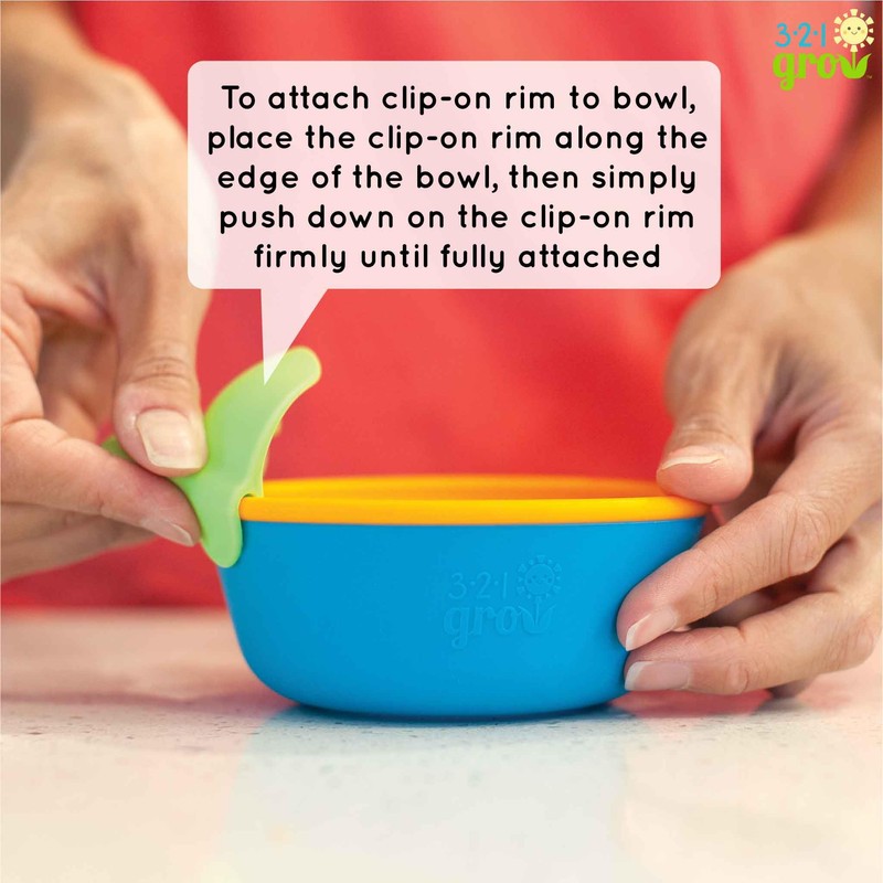 Set of 2 bowls and 2 clip-on rims. These fun, colorful bowls make meals and snack time a real hoot! Parents will love the clip-on rim and handle, which is a one-of-a-kind accessory that help kids develop their self-feeding skills.