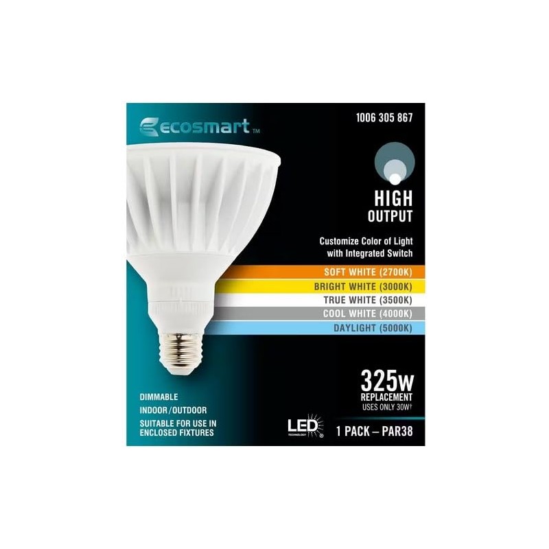 325W Equivalent 2700K, 3000K, 3500K, 4000K, 5000K Selectable PAR 38 Dimmable LED Floodlight Bulb (1-Pack), White