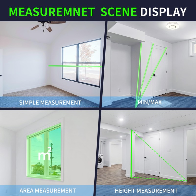 • 【Versatile Measuring Modes】Supports single/continuous/max/min readings, area, volume, and Pythagorean mode. Combined with the angle sensor, it quickly calculates vertical heights and diagonal lengths.