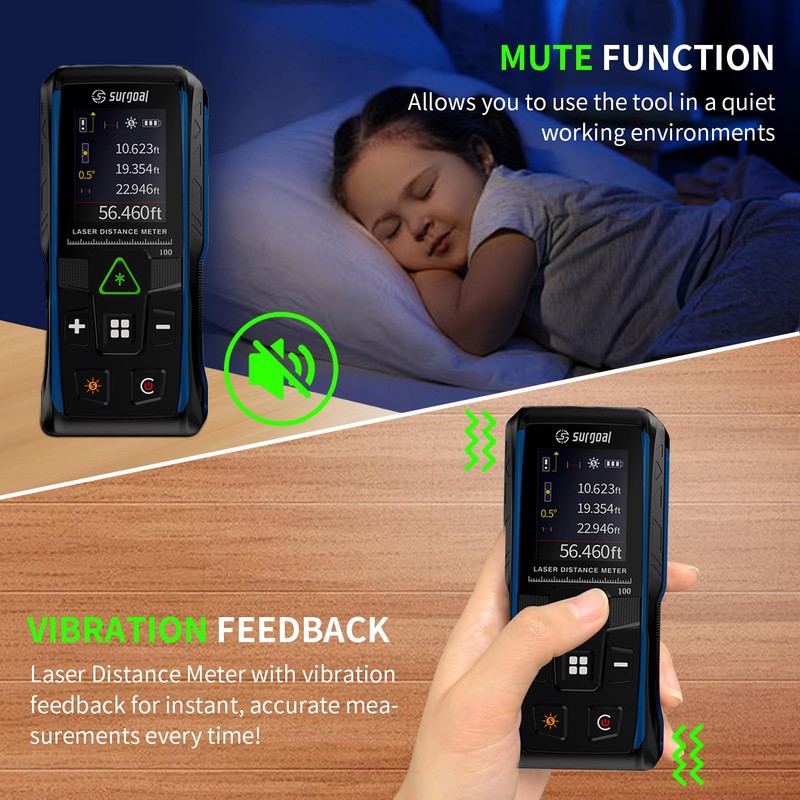 • 【Smart Features & Unit Switching】Switch between ft/in/m/ft+in easily. Includes silent mode, vibration alerts, 100-group memory, auto calculation, and reference change. User-friendly for both home users and professionals.
