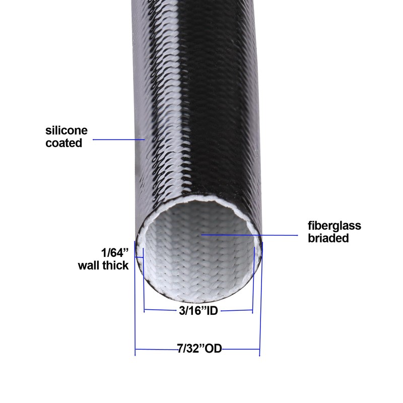 - Fiberglass/Silicone Sleeve Information - Inner Diameter:3/16",5/16",3/8",9/16",3/4",Outer Diameter:7/32",11/32",13/32",19/32",25/32",Wall Thickness:1/64",Length:32Feet,Minimum Continuous -65°F/-54°C,Maximum Continuous (MIL-I-23053) 500°F/260°C,Melt 2,048°F/1,120°C