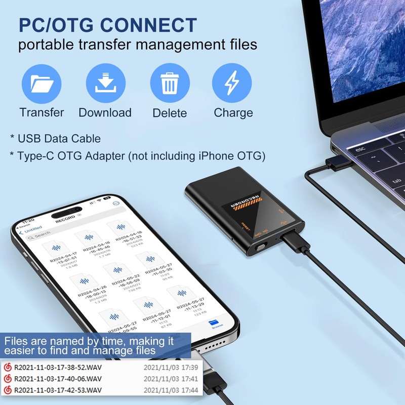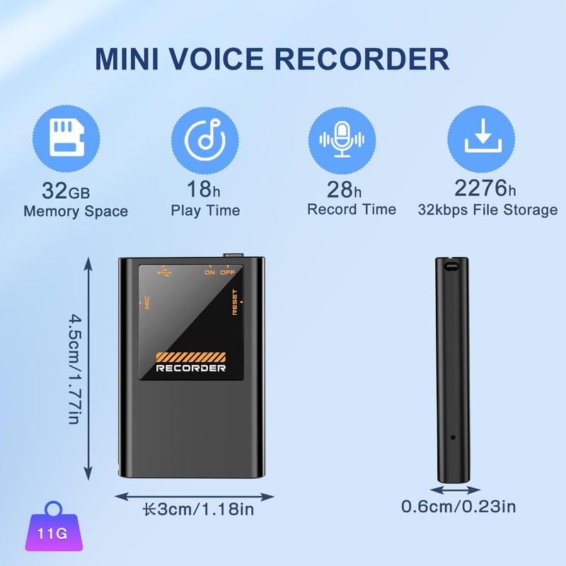 - 【Small size, large memory capacity】Size: 1.7*1.2*0.25in;Weight: 15g, 32GB memory can store up to 2276 hours of recording files (32kbps)