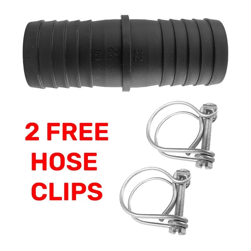 32mm (1.25") corrugated flexible pond pipe repair joiner/connector/hydroponics fitting+2 x double wire hose clips