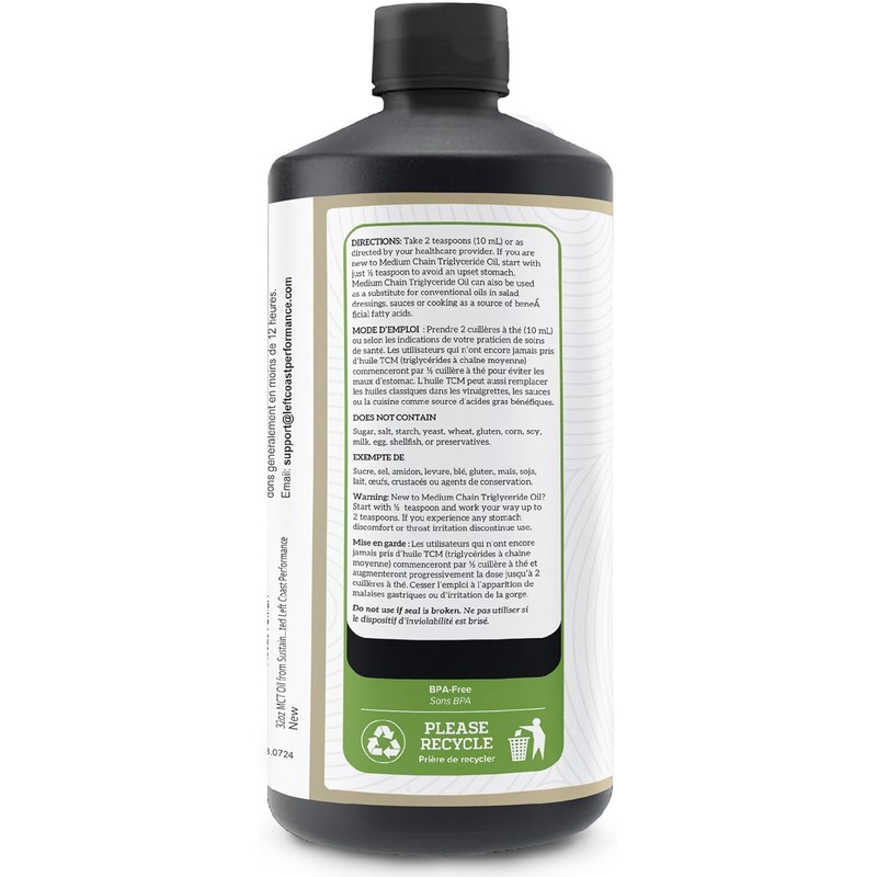 32oz MCT Oil from Sustainable Coconuts 60/40 C8/C10 Pure MCT OIl- Keto, Paleo Approved. Independently Quality Tested Left Coast Performance
