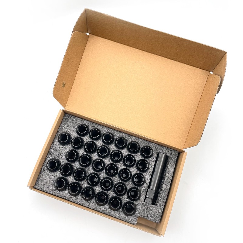 32PCS Black M14x1.5 Wheel Lug Nut,Conical/Cone Bulge Seat, Closed End Long Extended XL Spline with 1 Socket Key Fits 8 Lug Aftermarket Wheels